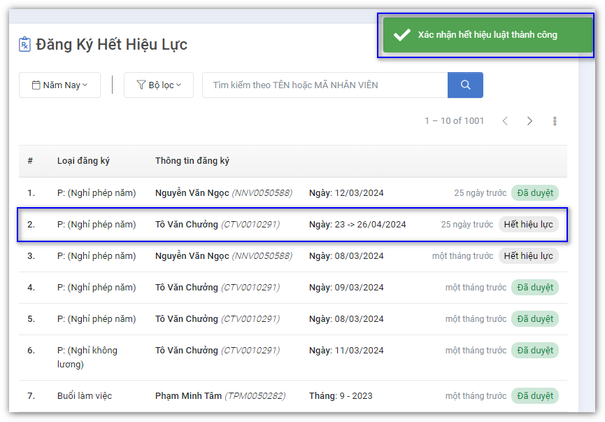 Vào menu Nội quy lao động, chọn Quản lý > Đăng ký hết hiệu lực (mục Admin).