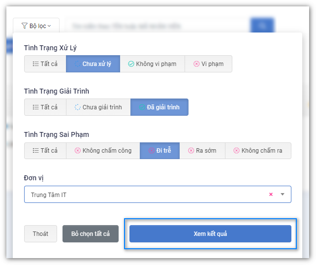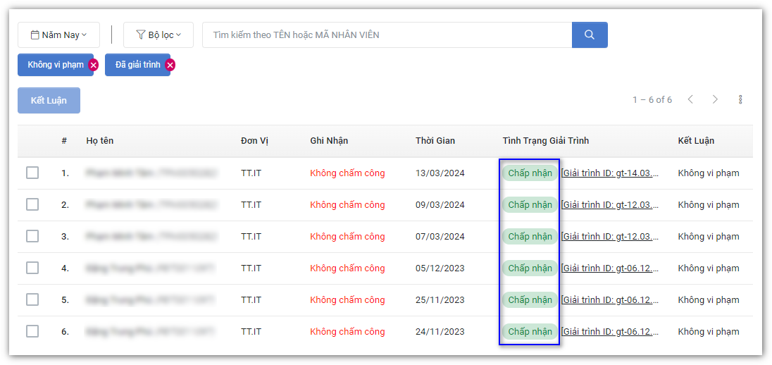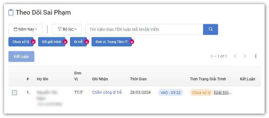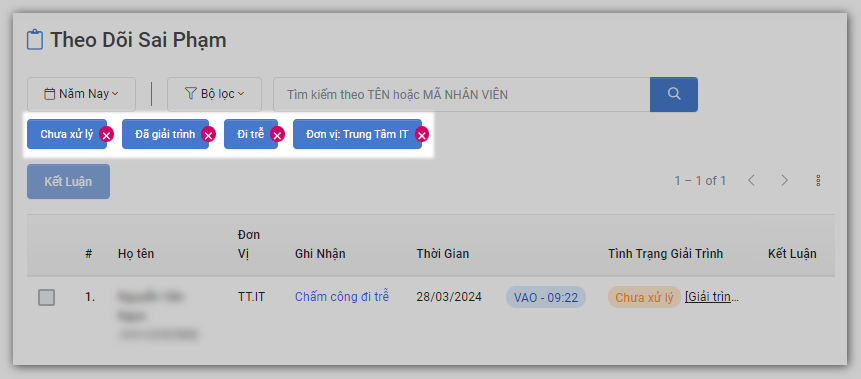 - (1): Đã xử lý phiếu giải trình xong hay chưa.