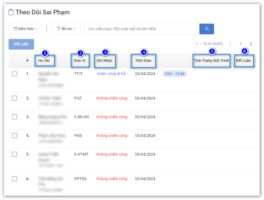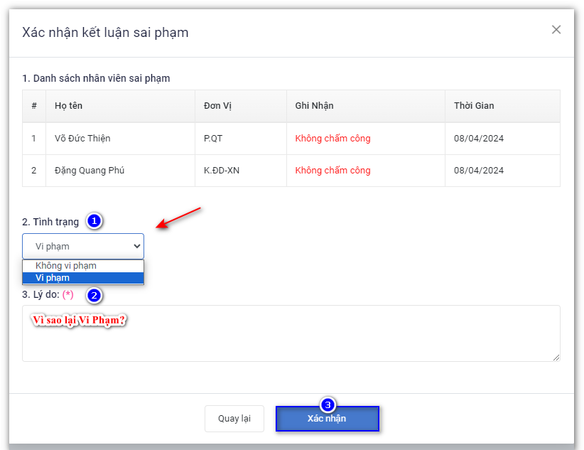 - (4): Ngày và giờ (chỉ xuất hiện khi mục (3) có ghi nhận là "Đi trễ" hoặc "Về/ra sớm" thì sẽ hiển thị) vi phạm