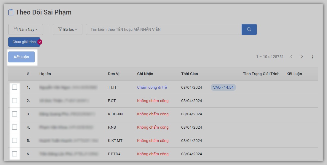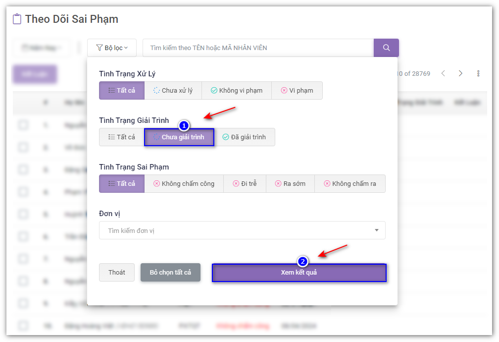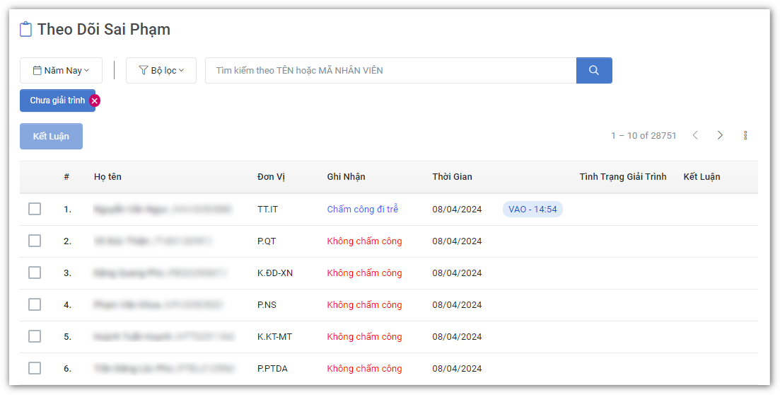 Chú ý! Nếu không có dữ liệu hiển thị thì đồng nghĩa với sai phạm đó chưa giải trình.