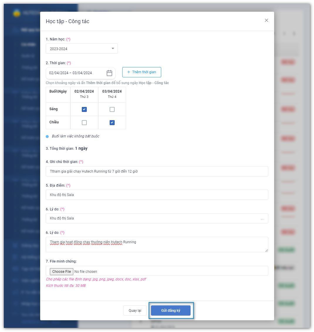 Đăng ký phiếu nghỉ cho mục đích đi công tác nơi xa