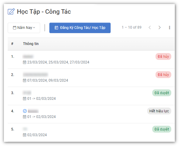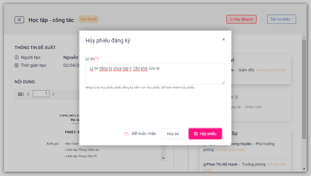 - Khi quy trình phiếu đã được phía Lãnh đạo duyệt thì sau khi hủy, phiếu đăng ký sẽ chuyển thành trạng thái Đã hủy. Thay vì trạng thái Nháp.