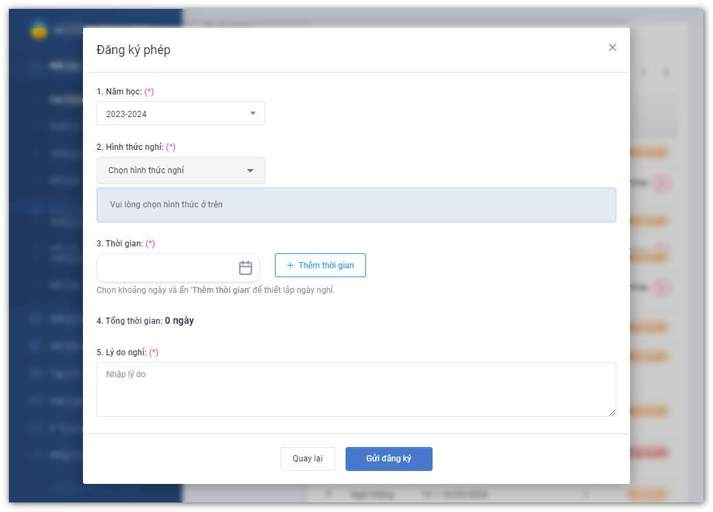 • (2): Loại hình thức muốn đăng ký. Mỗi hình thức sẽ có thời gian nghỉ phép khác nhau.