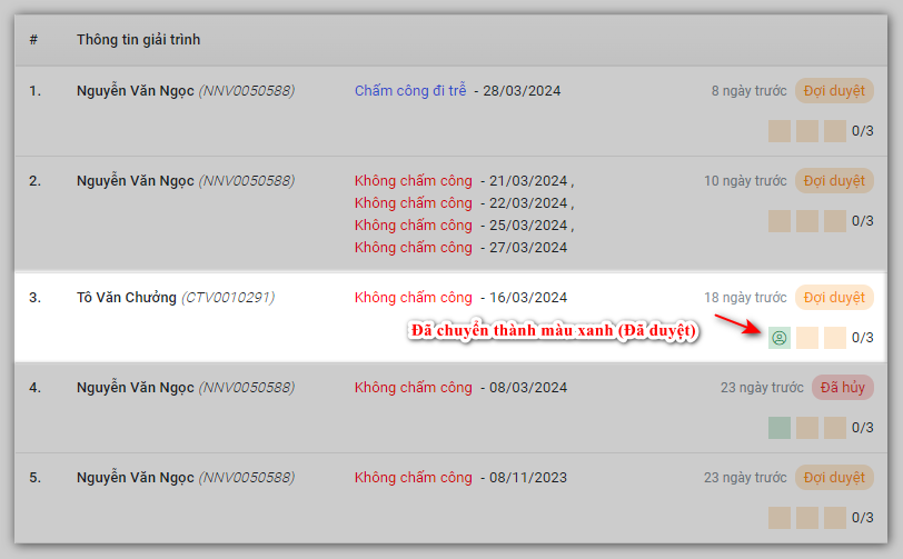 - Bộ phận quản lý: chờ Lãnh đạo duyệt xong mới được phép duyệt.