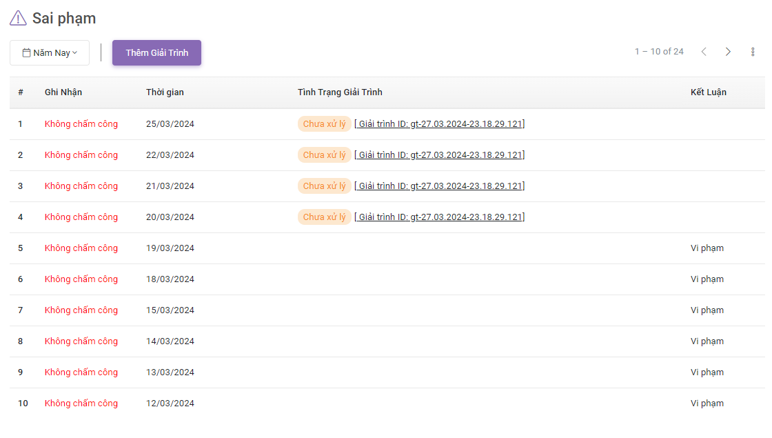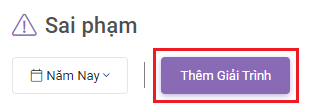 • Vào menu Nội quy lao động, chọn Cá nhân > Sai phạm, và nhấn nút Thêm giải trình.