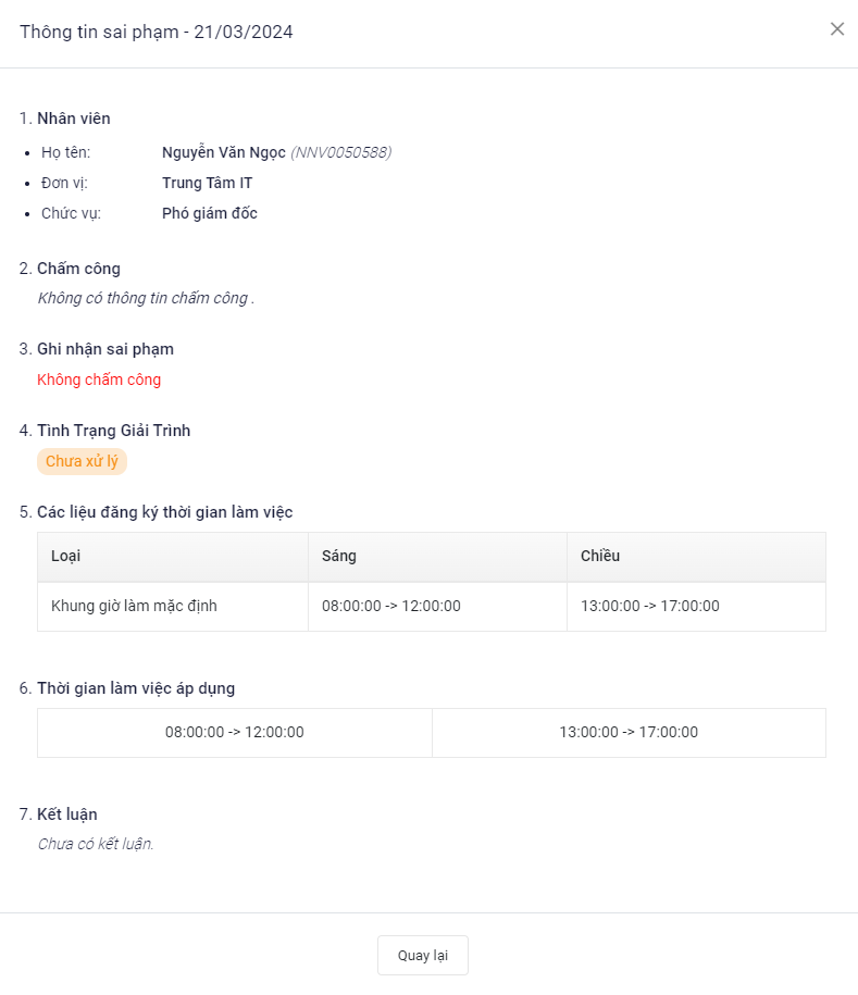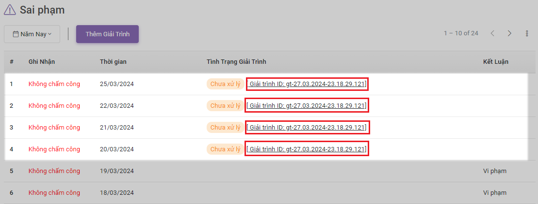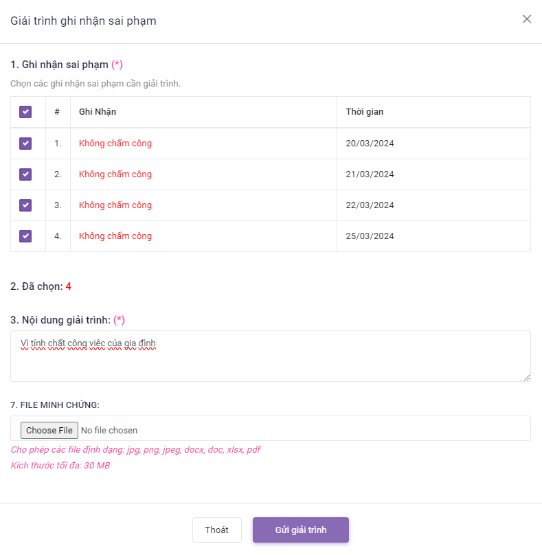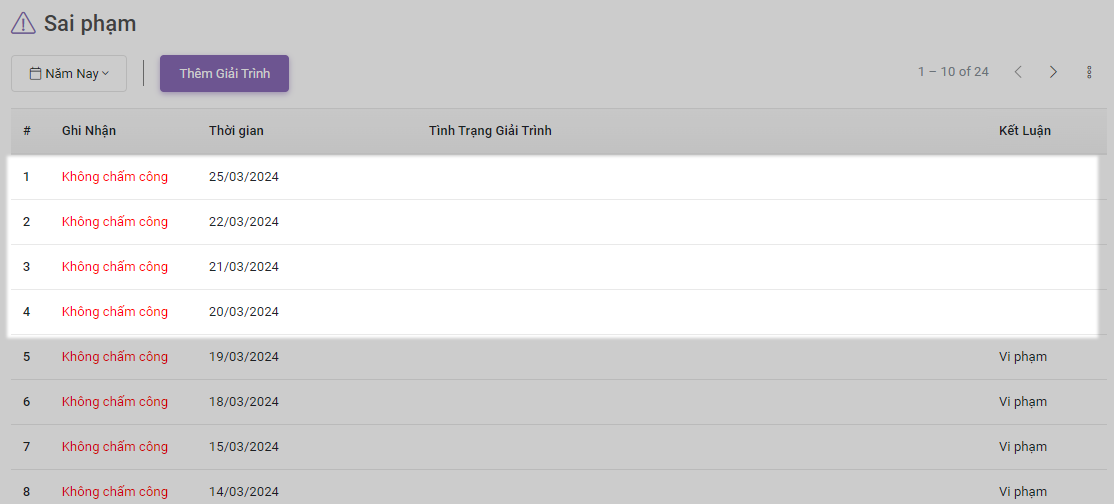 • Danh sách hiển thị sai phạm là thời gian mà Thầy/Cô đã vi phạm. Cần phải giải trình với lý do cụ thể