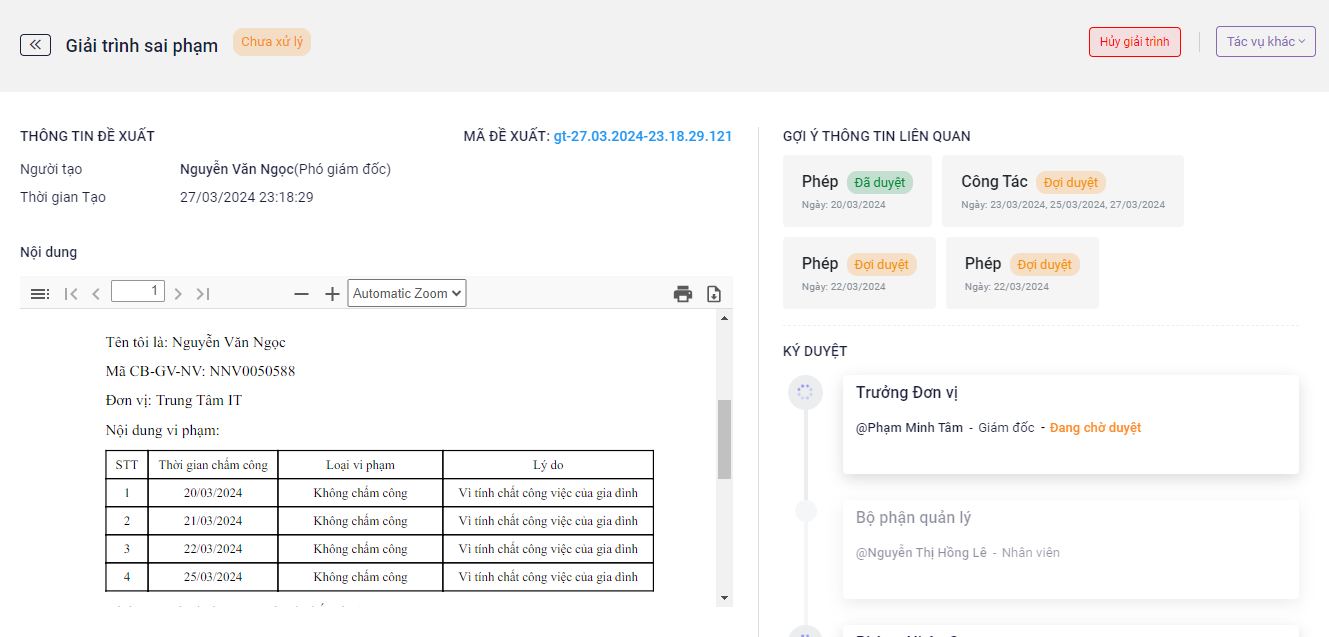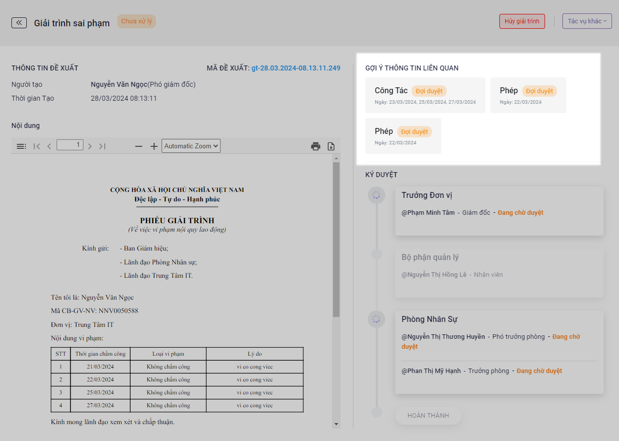 Chưa xử lý: Đang chờ các Lãnh đạo, Quản lý, ... duyệt phiếu.
