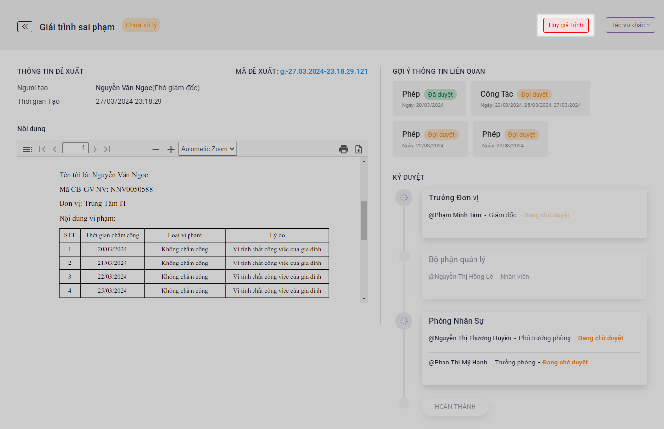 - Khi quy trình phiếu đã được phía Lãnh đạo duyệt thì sau khi hủy, phiếu đăng ký sẽ chuyển thành trạng thái Đã hủy. Thay vì trạng thái Nháp.