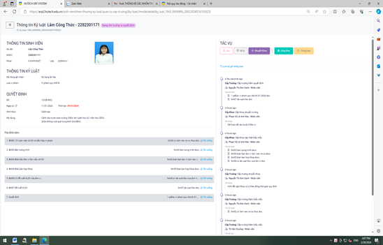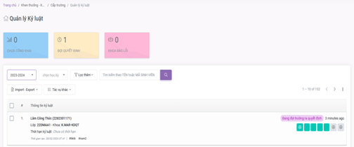 Cấp trường hoàn thành bước 1: cập nhật thông tin quyết định và file đề xuất KLSV và quyết định kỷ luật SV.